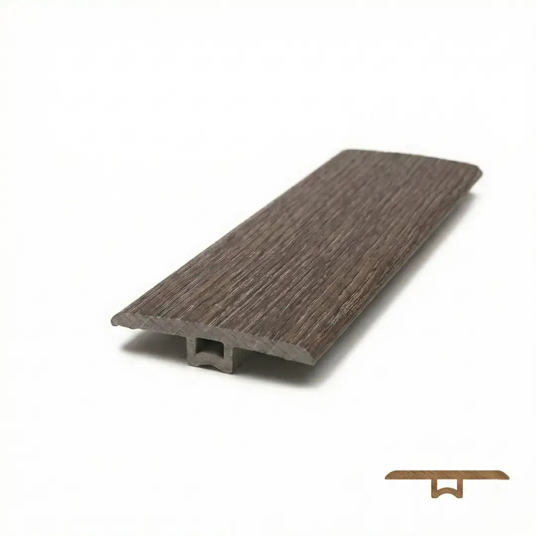 Diseñado para ejecutar transiciones impecables entre superficies de igual altura, el accesorio T-Moulding es la pieza técnica indispensable para unificar espacios. Su estructura con anclaje central se inserta milimétricamente en las juntas de dilatación, absorbiendo el movimiento natural de los pavimentos. Fabricado en polímeros de alta densidad (WPC, SPC y PVC), este perfil garantiza estabilidad estructural, resistencia a la abrasión y un acabado continuo que eleva la percepción de calidad en cualquier proyecto arquitectónico.