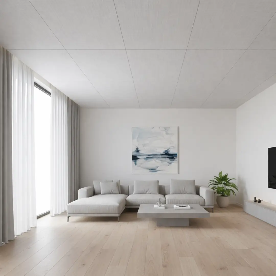 Es un cielo de SPC con una textura que imita la trama de una tela o lino. Es una solución práctica y honesta para quienes buscan salir del típico cielo liso y blanco, aportando un toque de diseño sutil sin complicaciones. Al ser SPC, es resistente, no se deforma con la humedad y se limpia pasando un paño, lo que lo hace mucho más duradero que un papel mural o una tela real en el techo.