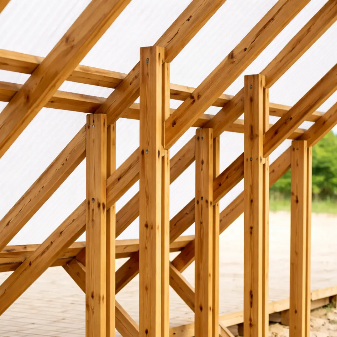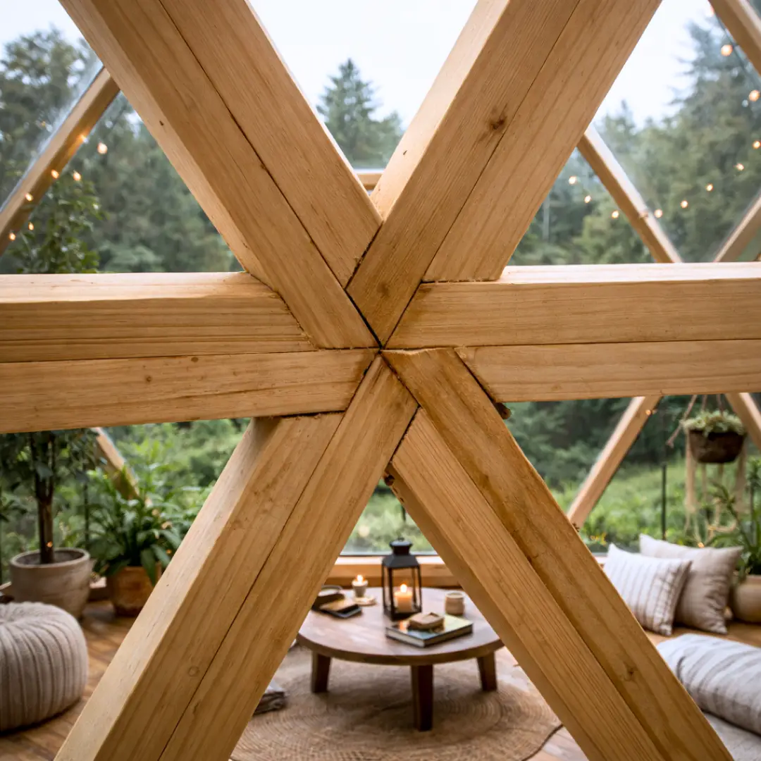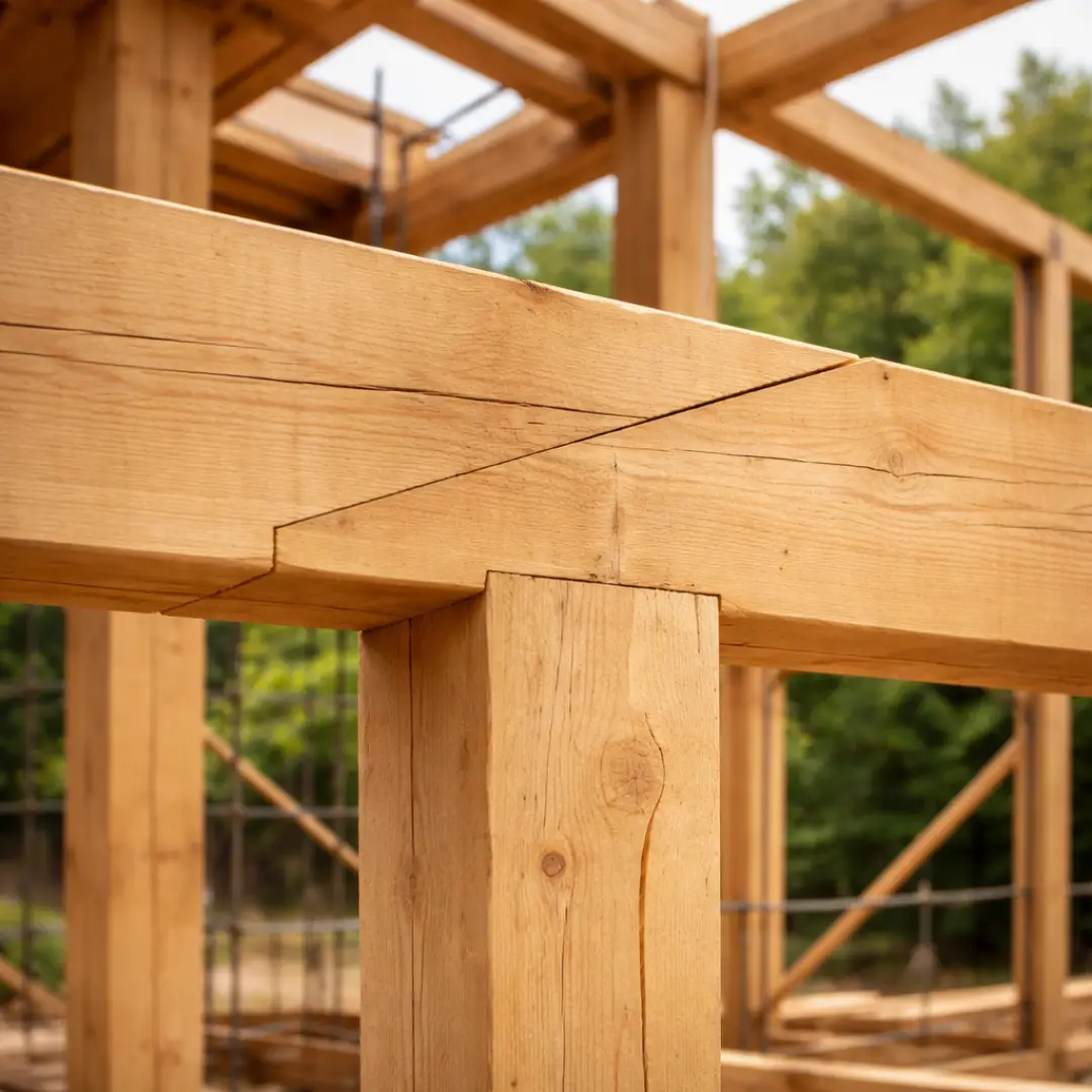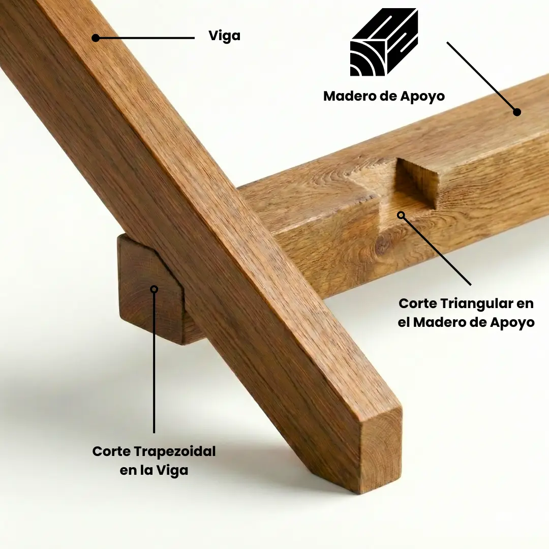 Sistemas tradicionales o híbridos que combinan técnicas de carpintería estructural con refuerzos modernos, incluyendo conectores cilíndricos ajustables.