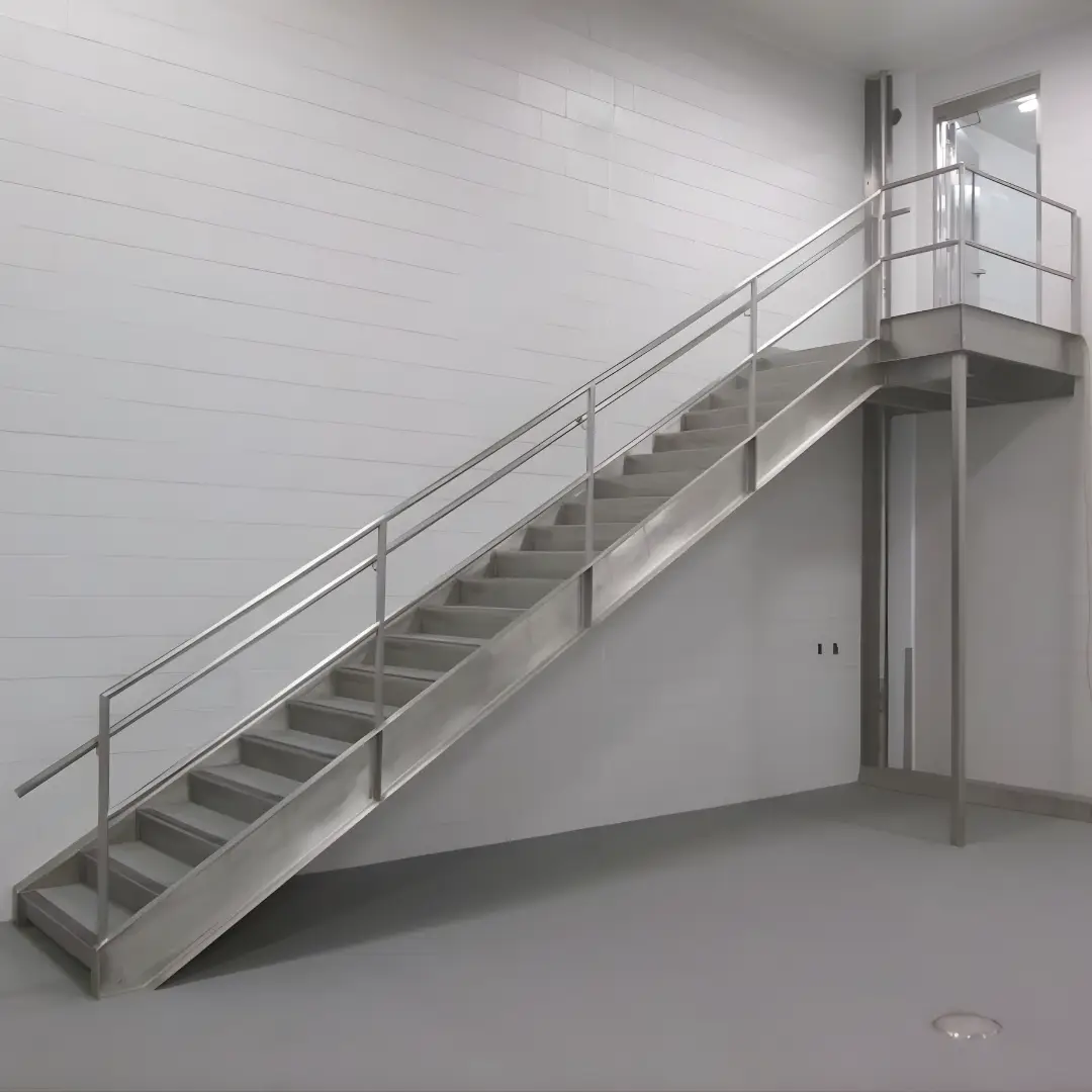 Esta escalera es una solución robusta y funcional, construida íntegramente en metal, lo que le confiere una gran durabilidad y resistencia. Su diseño se caracteriza por líneas limpias y una estructura visible, pensada para soportar un uso intensivo. Los peldaños y barandales metálicos garantizan la seguridad y un mantenimiento sencillo, siendo ideal para entornos que requieren alta higiene o resistencia a condiciones adversas.