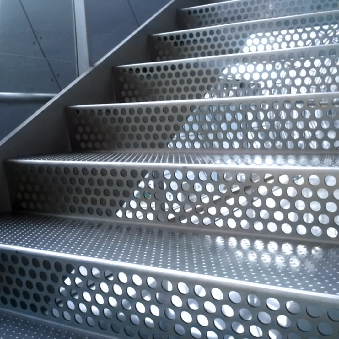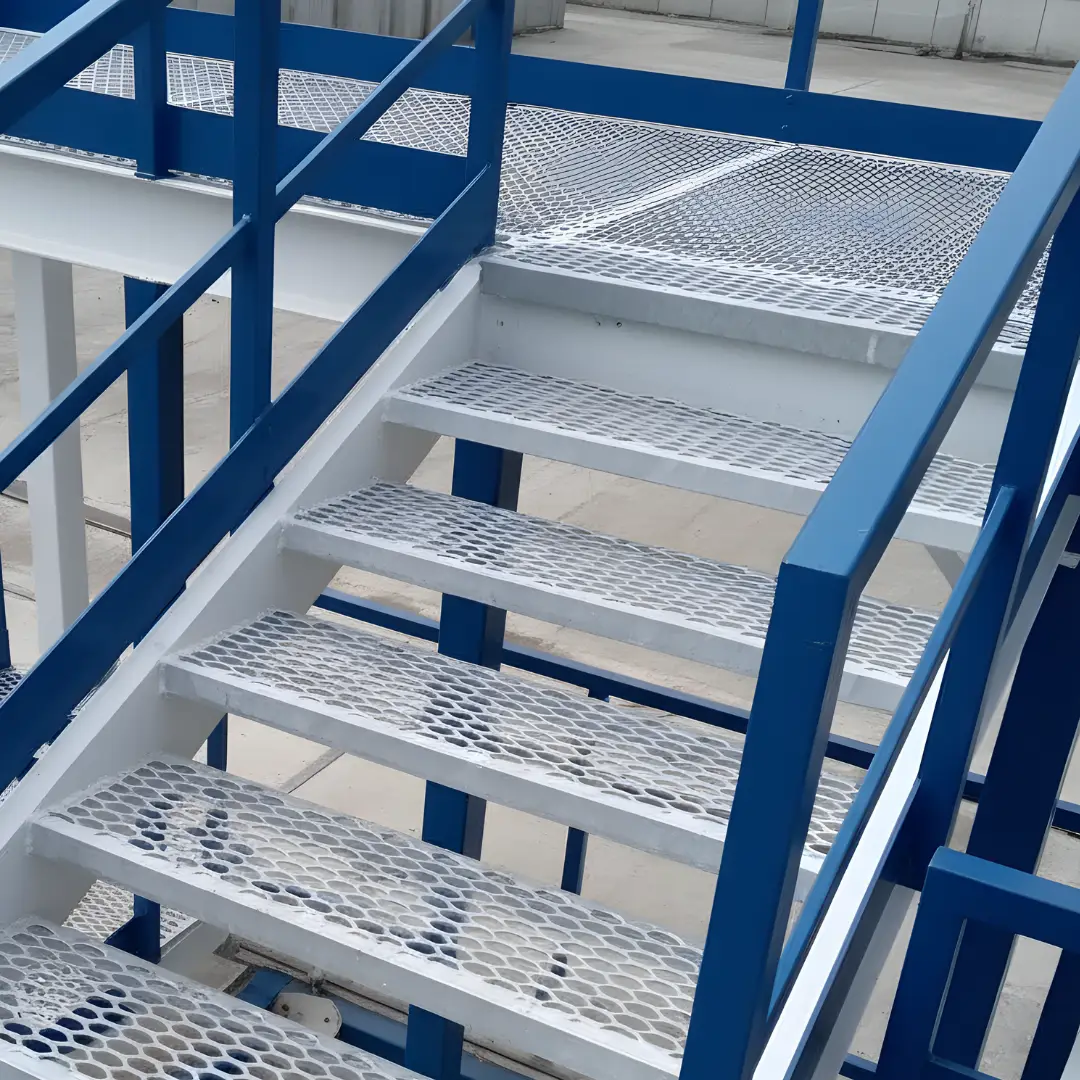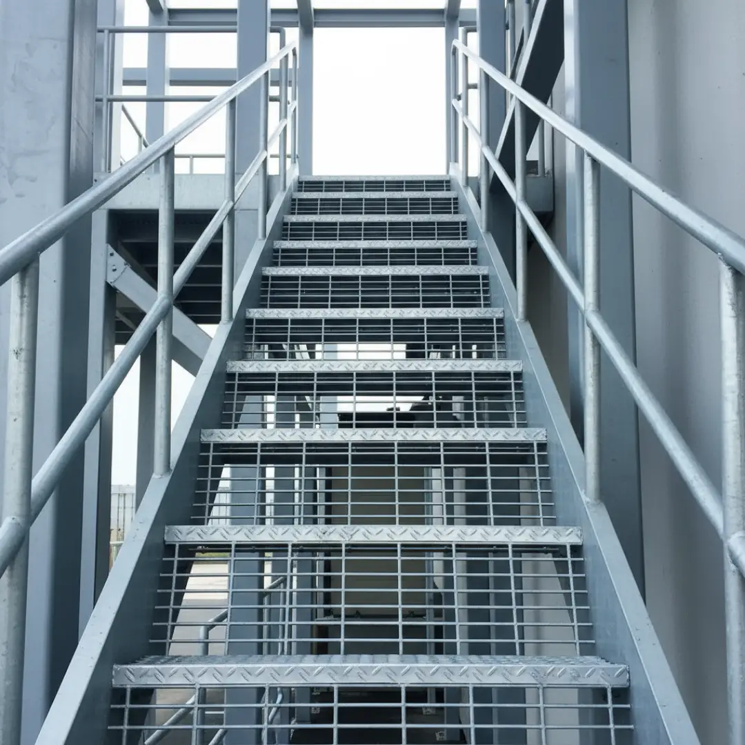 Esta escalera se caracteriza por sus peldaños de malla metálica, que ofrecen una superficie antideslizante y permiten el paso de luz y aire, evitando la acumulación de líquidos o residuos. Su construcción robusta y completamente metálica asegura una alta resistencia y durabilidad, ideal para entornos exigentes.