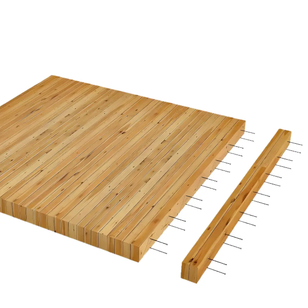 La madera laminada, también llamada laminado de clavos, es un tablero estructural fabricado al unir tablas gruesas de madera colocadas horizontalmente mediante clavos o tornillos. Esta técnica tradicional, con más de un siglo de uso, es muy valorada en la arquitectura por su resistencia y confiabilidad. Está hecha principalmente de madera aserrada maciza, como las piezas de 2 × 2 × 6, que son comunes en la construcción. Gracias a su robustez, es ideal para aplicaciones que requieren soporte sólido y duradero.