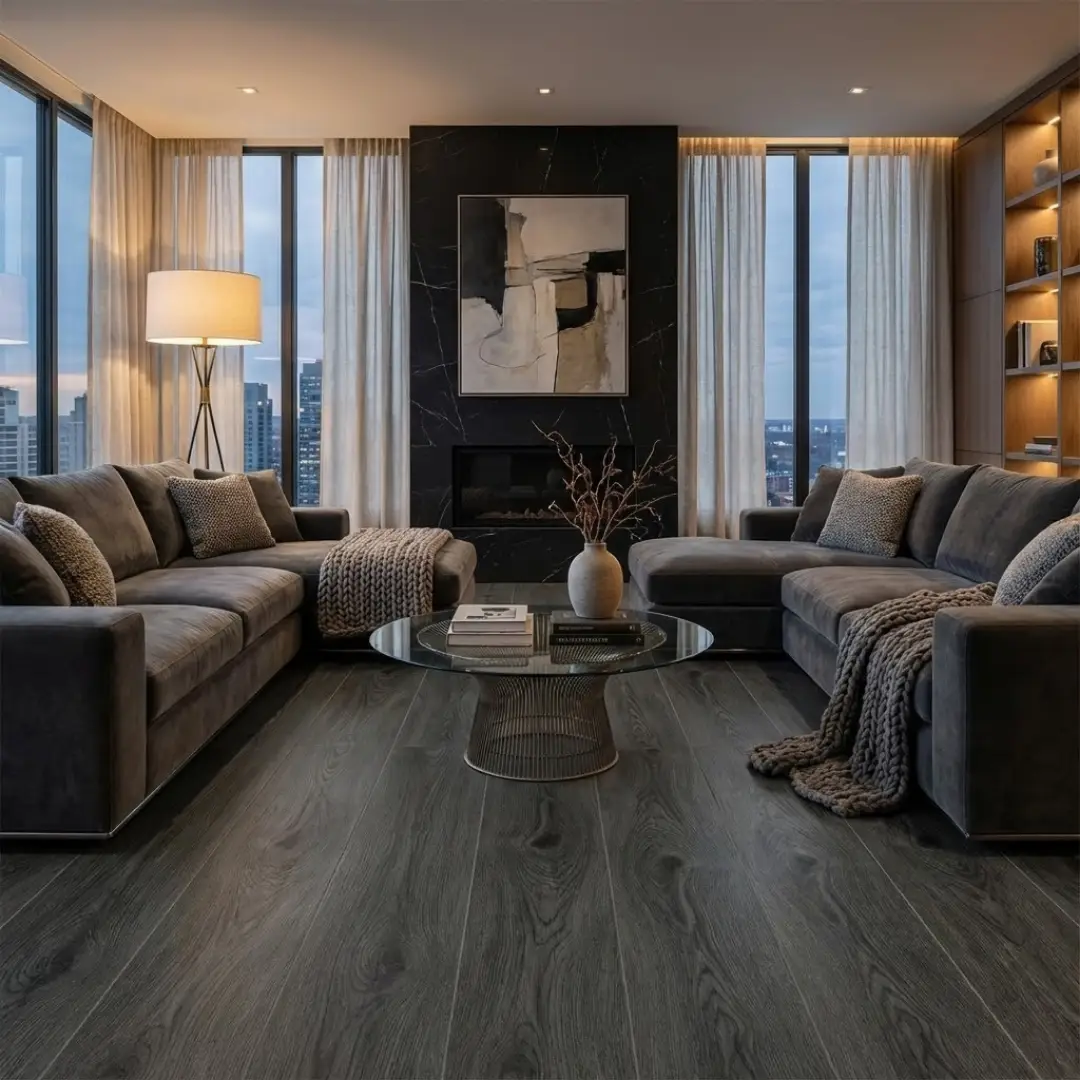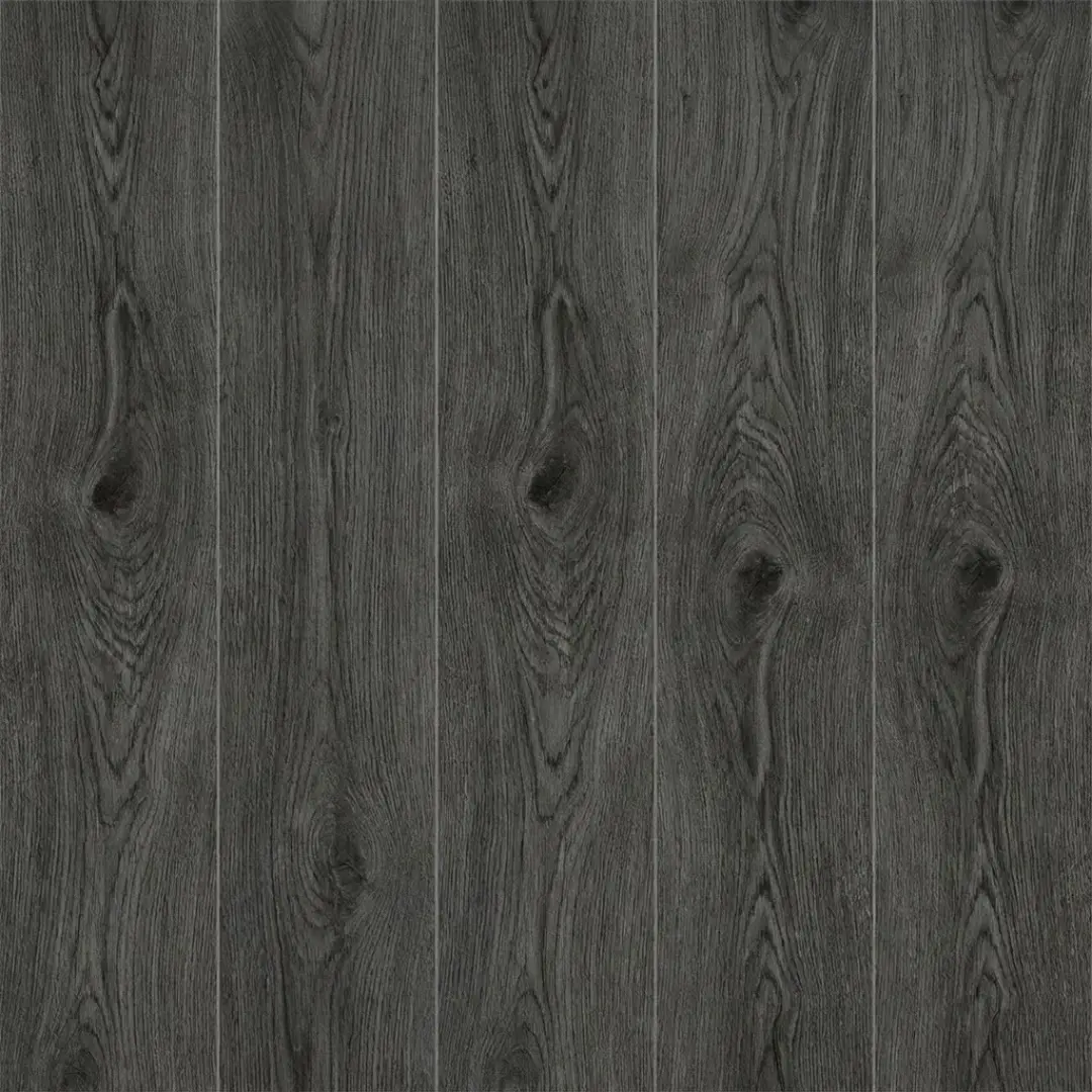 Porcelanato tipo madera de 20 cm x 120 cm en una imponente tonalidad gris carbón con vetas y nudos en contraste profundo. Su diseño evoca la madera quemada o tratada artesanalmente, aportando una textura visual dramática y una elegancia contemporánea inigualable.