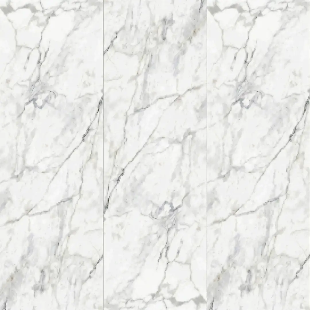Porcelanato de gran formato en medidas de 90 cm x 180 cm con un diseño clásico de mármol blanco Carrara, caracterizado por vetas grises suaves y fluidas sobre un fondo luminoso. Su acabado pulido de alto brillo refleja la luz de manera excepcional, creando una sensación de pureza y amplitud.