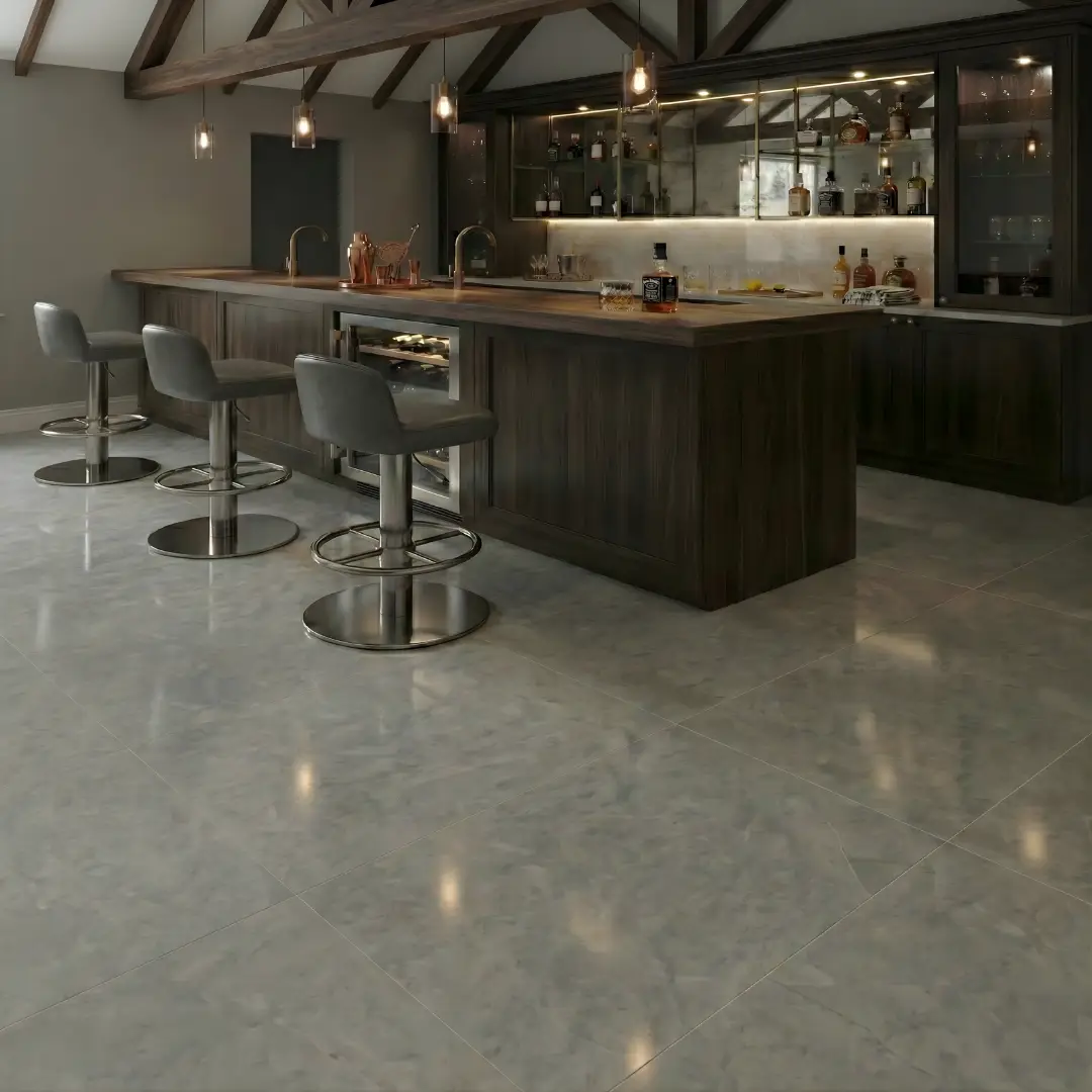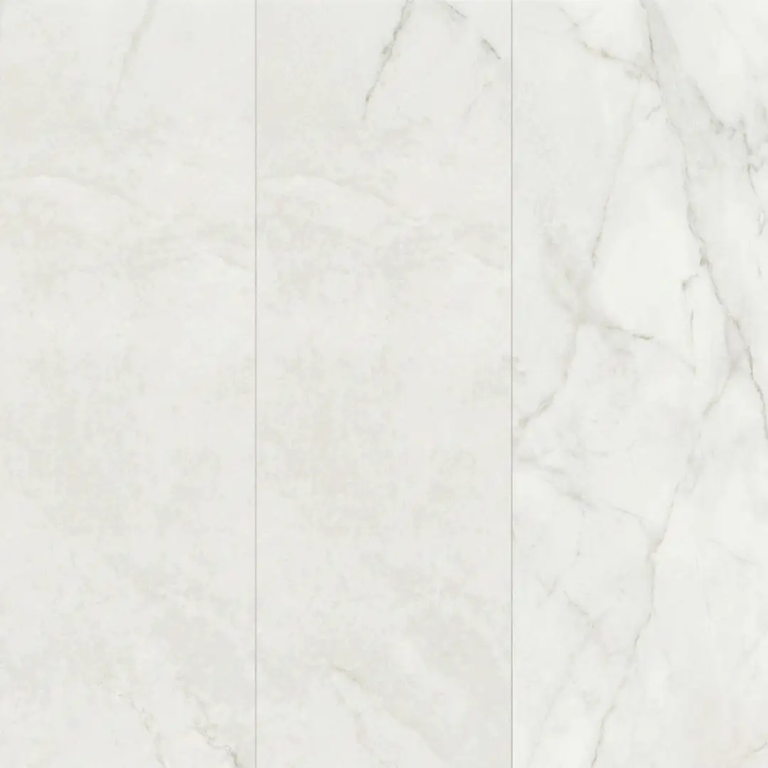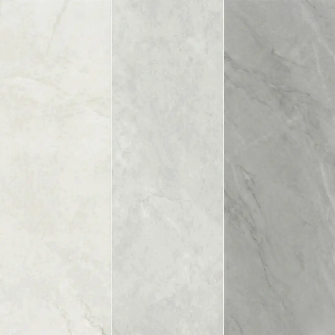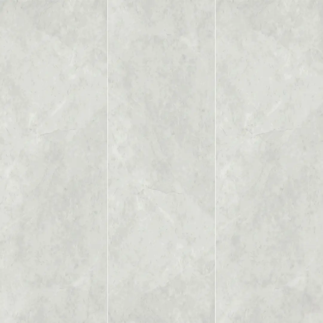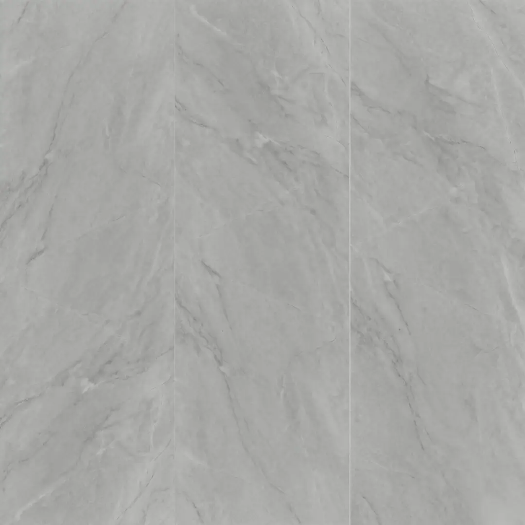 Porcelanato tipo mármol de 60 cm x 120 cm con un diseño de vetas fluidas en tonos grises suaves sobre un fondo neutro. Su acabado pulido de alto brillo refleja la luz de manera excepcional, aportando una sensación de amplitud y elegancia clásica a cualquier ambiente.