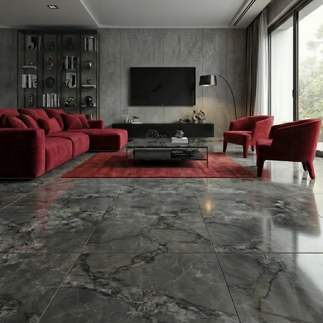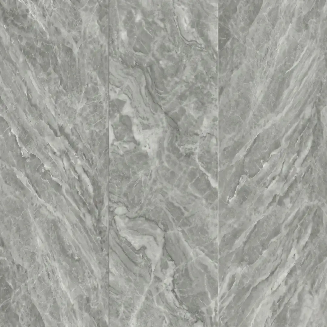 Mármol de gran formato en medidas de 90 cm x 180 cm, caracterizado por un diseño dramático de vetas multidireccionales en tonos grises profundos y blancos. Su acabado pulido de alto brillo y sus dimensiones imponentes crean superficies continuas con mínimas juntas, proyectando un lujo absoluto y una sofisticación arquitectónica de vanguardia.