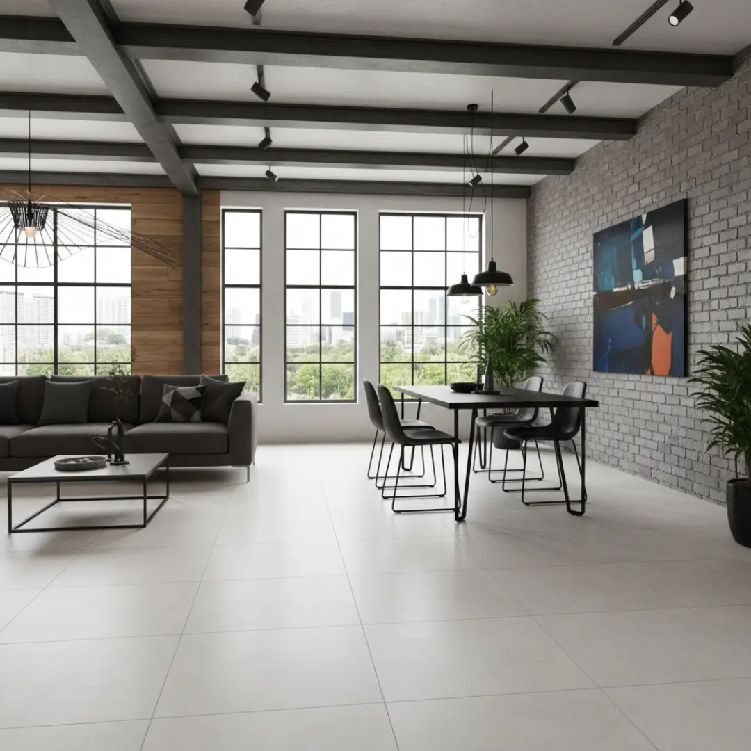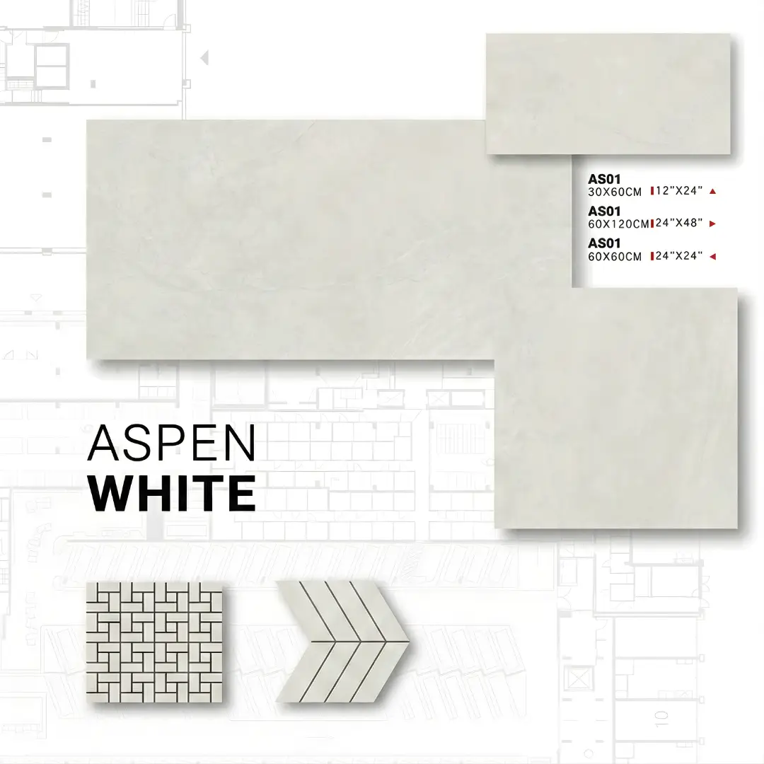 Porcelanato monocromático de estética minimalista Aspen White, disponible en una amplia gama de formatos que incluyen 60 cm x 120 cm, 60 cm x 60 cm, 30 cm x 60 cm y 30 cm x 30 cm. Su diseño se caracteriza por un blanco puro con sutiles matices pétreos que aportan una luminosidad excepcional y una sensación de limpieza absoluta.