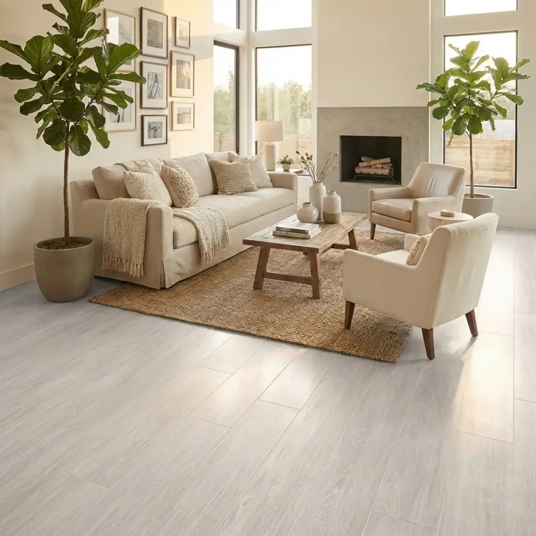 Porcelanato tipo madera de 20 cm x 120 cm con un diseño de roble blanqueado y veta lineal definida. Se distingue por su superficie limpia y uniforme que elimina el ruido visual, ideal para crear ambientes de estética purista y serena. Ofrece la máxima resistencia cerámica con un acabado táctil natural.
