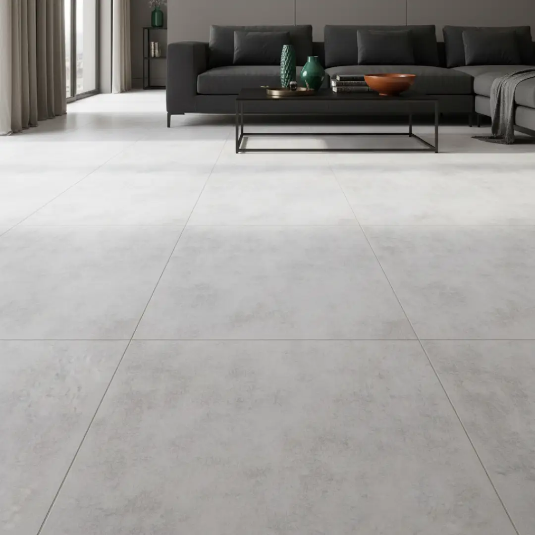 Porcelanato tipo cemento Impress en gran formato de 75 cm x 150 cm. Su diseño presenta una textura de concreto pulido con variaciones cromáticas que van desde tonos beige claro hasta grises medios, logrando un acabado orgánico y sofisticado.