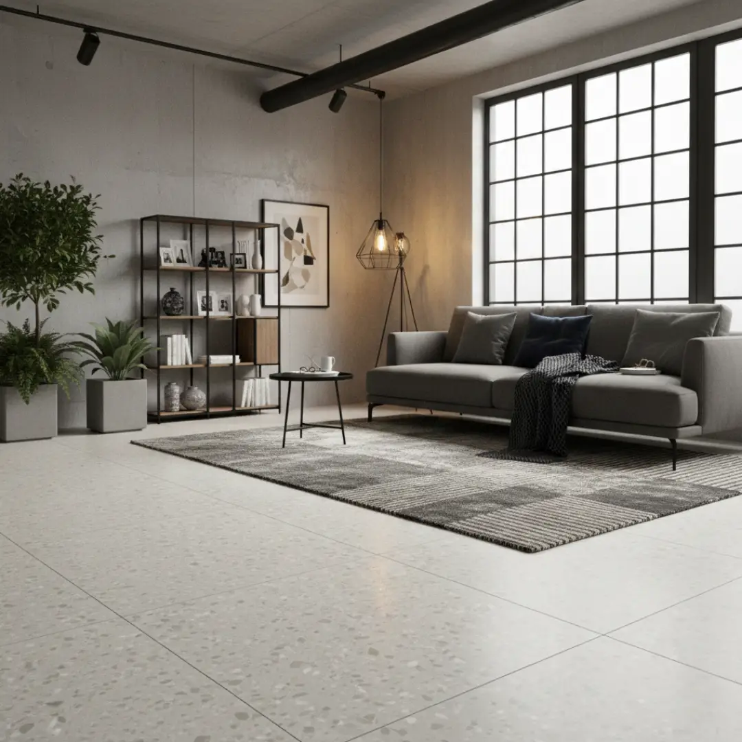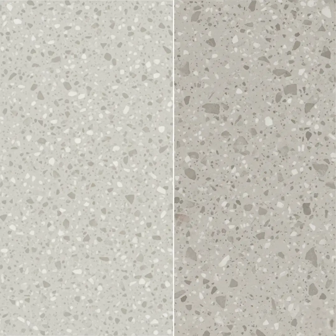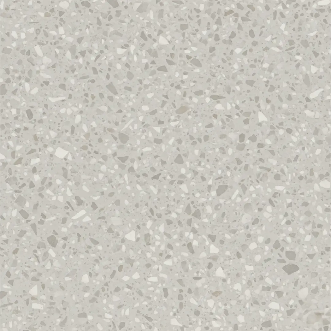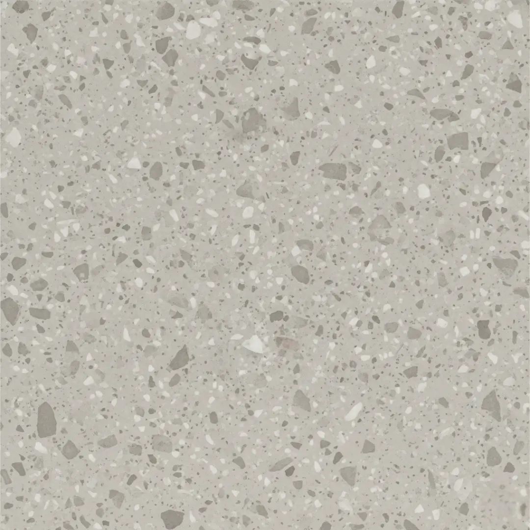 Porcelanato tipo terrazo Terrazo en formato monumental de 120 cm x 120 cm. Su diseño reinterpreta el clásico mosaico veneciano con una base gris cemento y fragmentos pétreos en diversas escalas y tonalidades neutras.